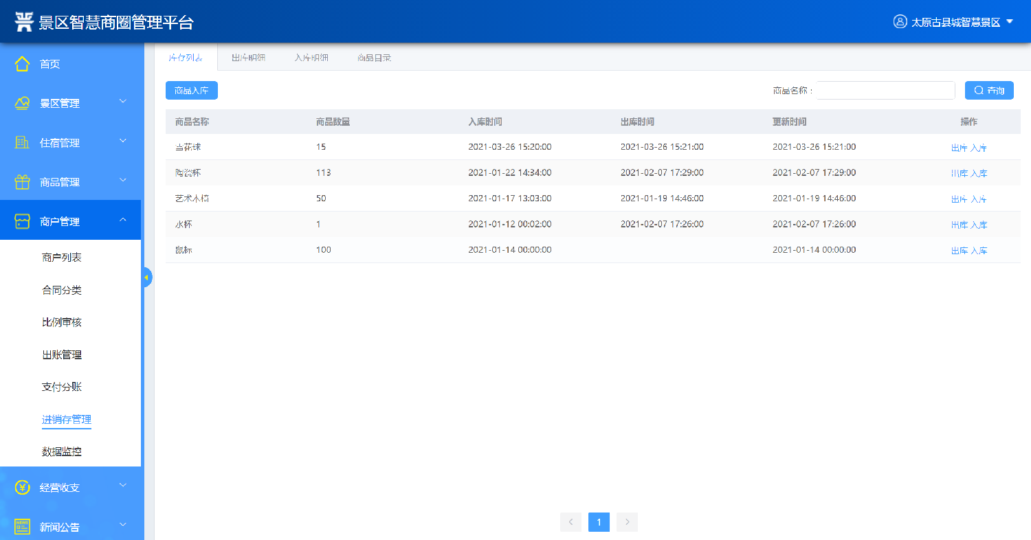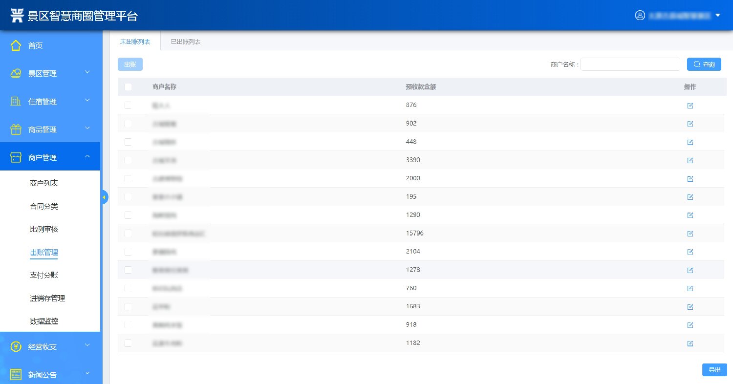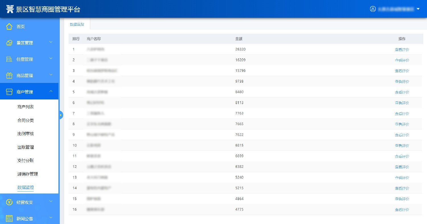 2.經(jīng)營商戶管理:系統(tǒng)后臺維護(hù)管理景區(qū)內(nèi)的經(jīng)營商戶,維護(hù)商戶的名稱、聯(lián)系手機(jī)、詳細(xì)地址等信息。能夠?qū)ι虘艉贤M(jìn)行分類管理,對于租金收取等做到到期前自動提醒;具備營銷管理功能,折扣管理功能,能夠體現(xiàn)預(yù)收款、以及預(yù)收款轉(zhuǎn)收入的情況;統(tǒng)一采購下需實現(xiàn)進(jìn)、銷、存動態(tài)管理功能;通過大數(shù)據(jù)監(jiān)控分析,對商戶進(jìn)行免租金,末位淘汰機(jī)制,同時對商戶進(jìn)行評價及分析。