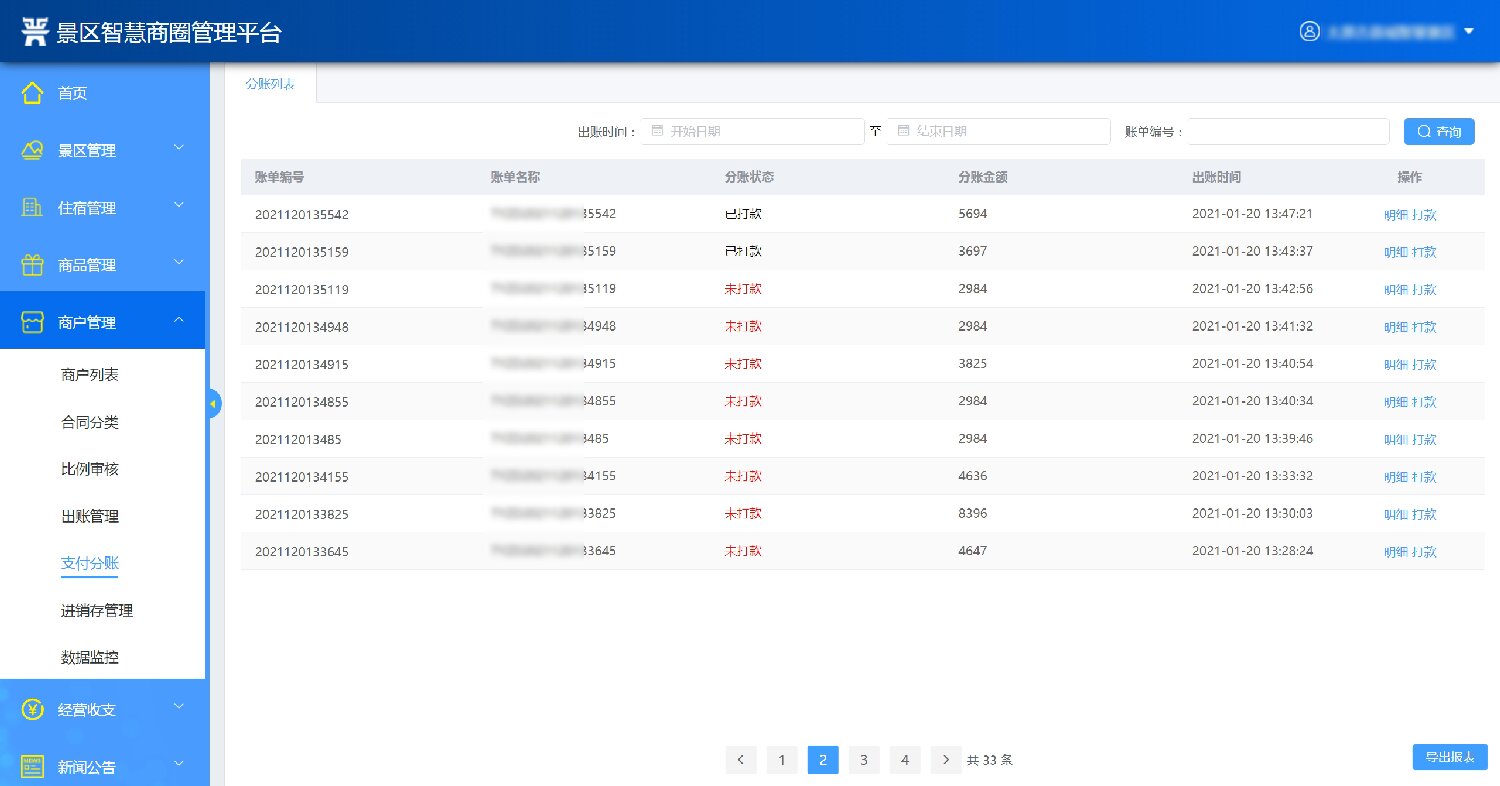9.支付分帳管理:系統(tǒng)實現(xiàn)商戶的支付分帳管理,后臺可設(shè)置分賬比例,支持微信和支付寶等,并以報表形式與銀行收單平臺對接。