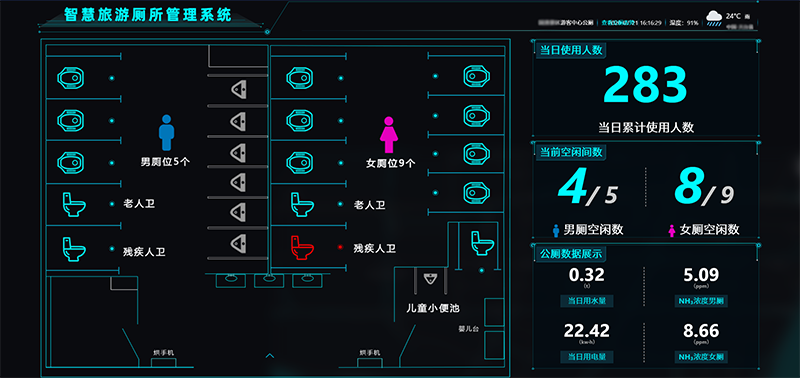 可以通過(guò)公廁外墻上的電子顯示屏,清晰的了解男、女廁和第三廁位分布情況,紅色亮起表示這個(gè)公廁目前有人使用。綠燈表示公廁空閑。通過(guò)這種直觀的方式就可以了解、判斷哪個(gè)廁位可用。公廁每個(gè)蹲位都安裝提供一鍵緊急呼叫按鈕,使用者按下呼叫鈴,工作人員將趕到廁所提供幫助。公廁門(mén)口架設(shè)蹲位顯示器,界面化的顯示廁所實(shí)際情況,同時(shí)還可以可投放第三方廣告商,第三方自動(dòng)售貨機(jī)。