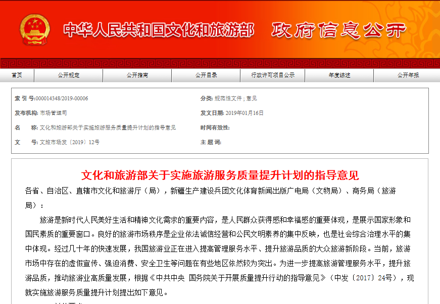 2019開年之際,文化和旅游部印發(fā)了《關(guān)于實(shí)施旅游服務(wù)質(zhì)量提升計(jì)劃的指導(dǎo)意見》(以下簡(jiǎn)稱《指導(dǎo)意見》)。