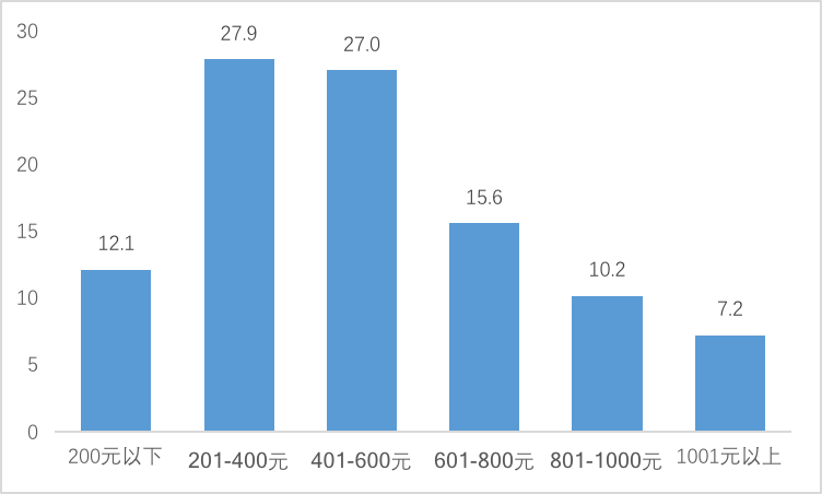 專項調(diào)查數(shù)據(jù)顯示,夜游花費在200-400元和400-600元之間的比重最高,分別為27.9%和27%,600-800元和200元以下居中,分別占比15.6%和12.1%,1000元以下比重最低。