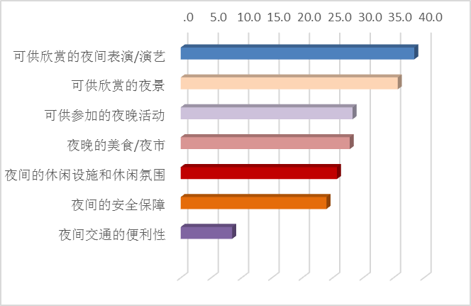 專項調(diào)查數(shù)據(jù)顯示,游客對景色、活動、餐飲、休閑等夜游要素的訴求相對均衡,35.7%的受訪者人群關注可供欣賞的美景,夜晚活動、休閑氛圍、安全保障、美食/夜市的訴求比重在23%-28%之間。如今愈發(fā)多元的夜間消費場景為城市的夜晚注入了活力。游客希望在有限的時間內(nèi)體驗更多活動,享受更多的服務,夜游產(chǎn)品的豐富程度和品質(zhì)需求并重。