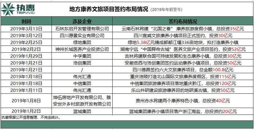 與此同時(shí),地方多個(gè)省市康養(yǎng)文旅項(xiàng)目簽約正在提速。執(zhí)惠統(tǒng)計(jì)的信息顯示,2019年年初以來,重慶、云南、四川、湖南、安徽、浙江等地陸續(xù)簽約布局康養(yǎng)類旅游小鎮(zhèn)項(xiàng)目,數(shù)量高達(dá)12起,總簽約金額近650億元,包括綠地集團(tuán)、藍(lán)城集團(tuán)、中信集團(tuán)等企業(yè)。其中金額最大的要屬中信集團(tuán)簽約的三塘蓋國際旅游康養(yǎng)度假區(qū)項(xiàng)目。今年1月,重慶黔江區(qū)政府與中信集團(tuán)全資子公司——中信正業(yè)簽約三塘蓋國際旅游康養(yǎng)度假區(qū)項(xiàng)目,總投資達(dá)120億元,規(guī)劃區(qū)面積29平方公里。