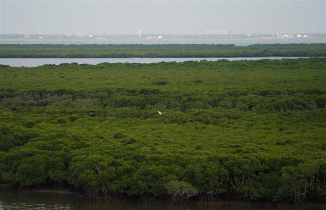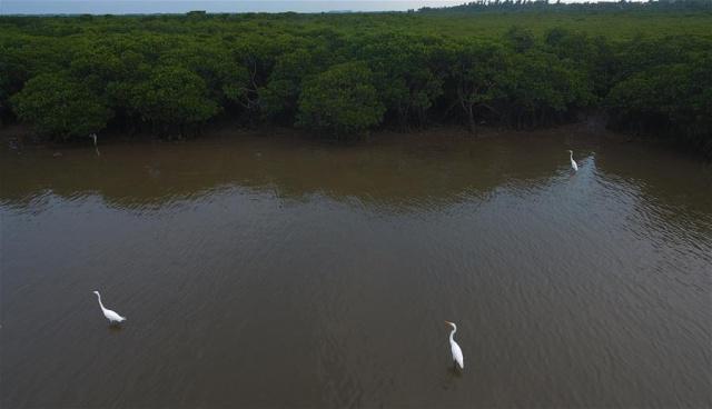 在海南東寨港國家級自然保護(hù)區(qū),白鷺在保護(hù)區(qū)紅樹林附近休憩(4月10日無人機(jī)拍攝)。 新華社記者 楊冠宇 攝