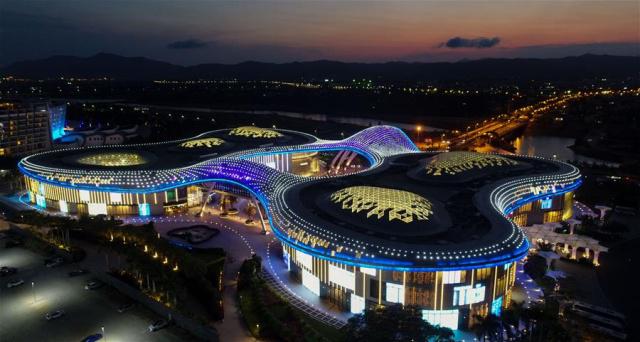 位于海南省三亞市海棠灣的三亞國際免稅城夜景(4月13日無人機(jī)拍攝)。 新華社記者 楊冠宇 攝