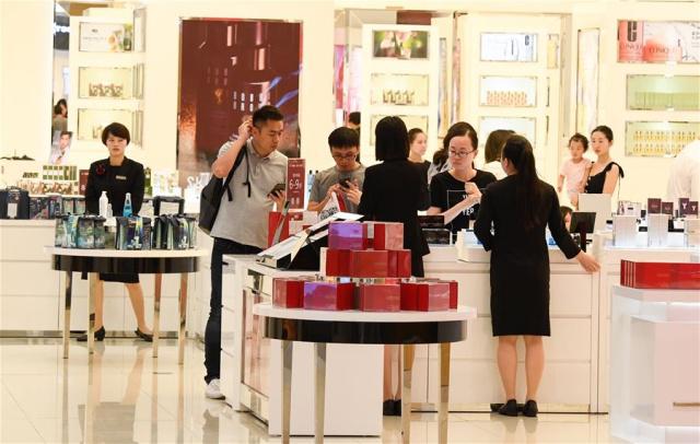 在海南省海口市內(nèi)的免稅店,顧客在選購商品(4月9日攝)。 新華社記者 楊冠宇 攝