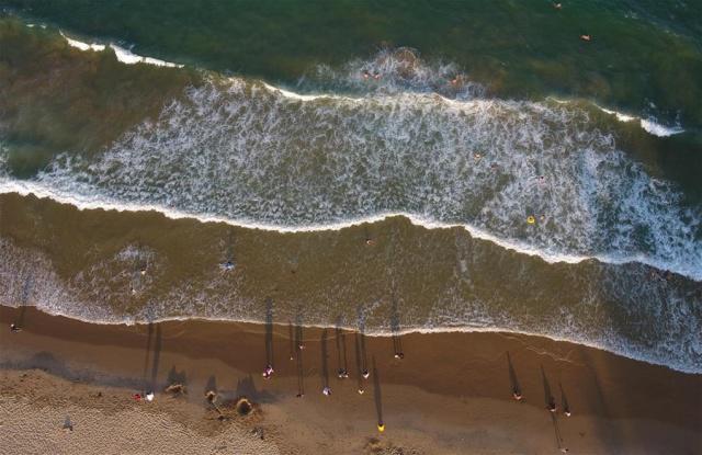 游客在海南省三亞市海棠灣海灘上游玩(4月13日無人機(jī)拍攝)。新華社記者 賀燦鈴 攝