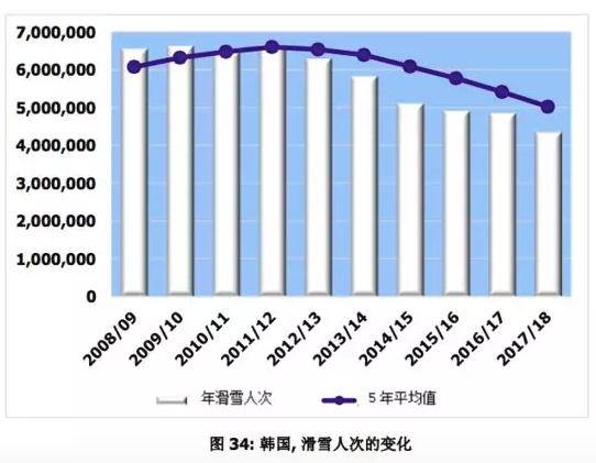 值得重點(diǎn)關(guān)注的是,2018 年平昌冬奧會(huì)的召開,完全沒能提高滑雪在韓國的受歡迎程度。2017-2018年雪季的滑雪人次較前一年大跌10%,較 5 年平均水平下降 20%。