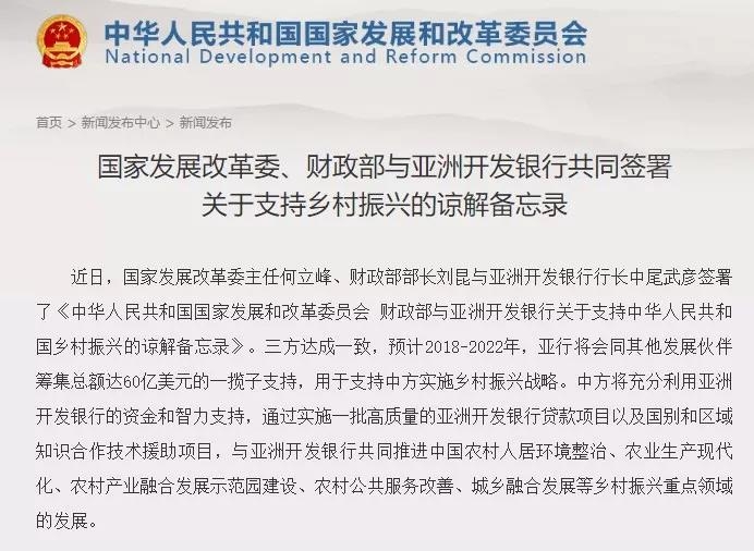 亞洲開發(fā)銀行:國家發(fā)展改革委、財(cái)政部、亞洲開發(fā)銀行三方達(dá)成一致,預(yù)計(jì) 2018-2022 年,亞行將會(huì)同其他發(fā)展伙伴籌集總額達(dá) 60 億美元的一攬子支持,用于支持中方實(shí)施鄉(xiāng)村振興戰(zhàn)略。