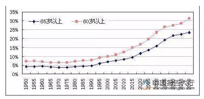 據(jù)資料顯示,中國的老齡化擁有兩個(gè)世界第一:一是老齡人口數(shù)量世界第一;二是老齡化速度世界第一。世界上還沒有任何一個(gè)國家,老化得像中國這么迅速。預(yù)計(jì)到2020年,我國60歲以上老人將超過2.5億,占比為17.5%。2025年,我國60歲以上老人將達(dá)到3億,占比為21%,65歲以上老年人比例也將達(dá)到13.7%,接近深度老齡化社會(huì),我國將在2027年進(jìn)入深度老齡化社會(huì)。而世界衛(wèi)生組織的預(yù)測,2033年前后中國老齡人口將翻番到4億,到2050年,中國將有35%的人口超過60歲,成為世界上老齡化最嚴(yán)重的國家。
