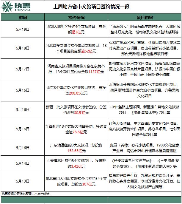 執(zhí)惠不完全統(tǒng)計(jì)顯示,上周(5月13-19日),各地方省市文旅迎來大批量集中簽約,協(xié)議簽約金額共計(jì)1962億元,涵蓋河南、河北、湖北、廣東、山東、江西、陜西、新疆等區(qū)域,涉及80余個(gè)項(xiàng)目,囊括特色小鎮(zhèn)、主題公園、田園綜合體、實(shí)景演藝、溫泉度假區(qū)、遺址開發(fā)等多種業(yè)態(tài)。(如下圖所示)
