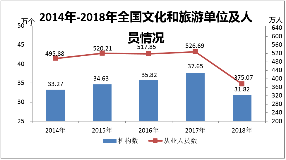 2018年末,納入統(tǒng)計范圍的全國各類文化和旅游單位31.82萬個,從業(yè)人員375.07萬人。其中,各級文化和旅游部門所屬單位66835個,增加91個;從業(yè)人員67.06萬人,增加0.34萬人。