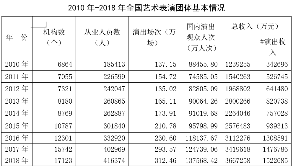 全年全國藝術(shù)表演團(tuán)體共演出312.46萬場,比上年增長6.4%,其中赴農(nóng)村演出178.82萬場,赴農(nóng)村演出場次占總演出場次的57.2%;國內(nèi)觀眾13.76億人次,比上年增長10.3%,其中農(nóng)村觀眾7.79億人次;總收入366.73億元,比上年增長7.2%,其中演出收入152.27億元,增長3.1%。