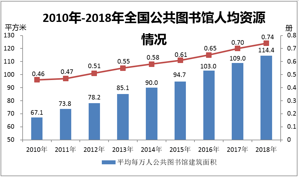 年末全國平均每萬人公共圖書館建筑面積114.4平方米,比上年末增加5.4平方米;全國人均圖書藏量0.74冊,比上年末增加0.04冊;全年全國人均購書費(fèi)1.77元,比上年末增加0.07元。