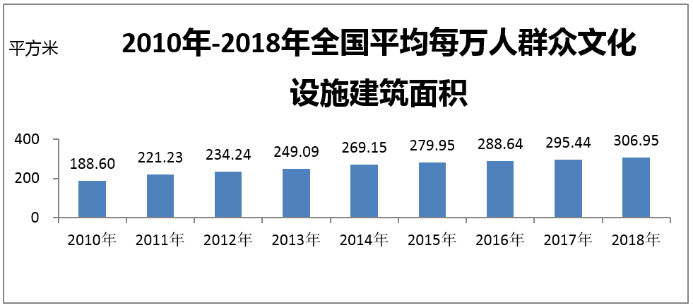 年末全國群眾文化機(jī)構(gòu)實(shí)際使用房屋建筑面積4283.09萬平方米,比上年末增長4.3%;業(yè)務(wù)用房面積3146.17萬平方米,比上年末增長5.7%。年末全國平均每萬人群眾文化設(shè)施建筑面積306.95平方米,比上年末提高11.51平方米。