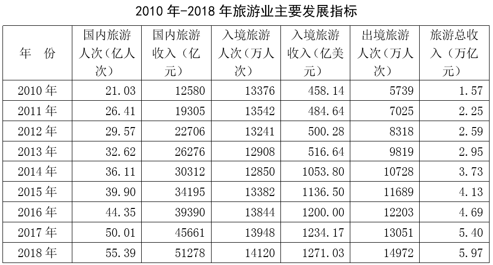 2018年國內(nèi)旅游市場持續(xù)平穩(wěn)增長,入境旅游市場穩(wěn)步進(jìn)入緩慢回升通道,出境旅游市場快速發(fā)展。全年國內(nèi)旅游人數(shù)55.39億人次,比上年同期增長10.8%;入境旅游人數(shù)14120萬人次,比上年同期增長1.2%;出境旅游人數(shù)14972萬人次,比上年同期增長14.7%;全年實(shí)現(xiàn)旅游總收入5.97萬億元,同比增長10.5%。