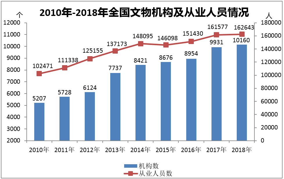 年末全國共有各類文物機(jī)構(gòu)10160個,比上年末增加229個。其中,文物保護(hù)管理機(jī)構(gòu)3550個,占34.9%;博物館4918個,占48.4%。年末全國文物機(jī)構(gòu)從業(yè)人員16.26萬人,比上年末增加0.11萬人。其中高級職稱9682人,占6.0%,中級職稱20679人,占12.7%。