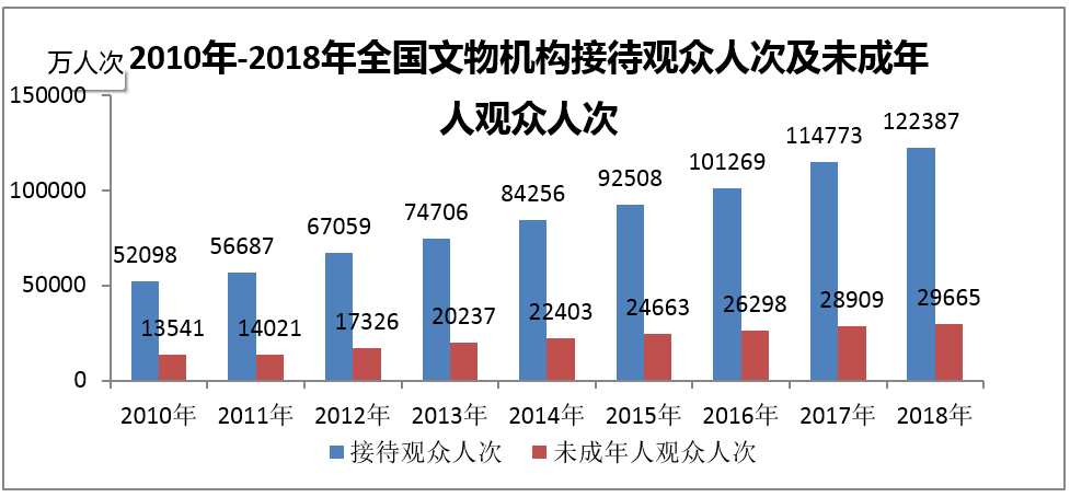 2018年全國各類文物機(jī)構(gòu)共舉辦陳列展覽27919個,比上年增加1874個。其中,基本陳列13676個,比上年增加651個;臨時展覽14243個,比上年增加1223個。接待觀眾122387萬人次,比上年增長6.6%,其中未成年人29665萬人次,增長2.6%,占參觀總?cè)藬?shù)的24.2%。博物館接待觀眾104436萬人次,比上年增長7.5%,占文物機(jī)構(gòu)接待觀眾總數(shù)的85.3%。
