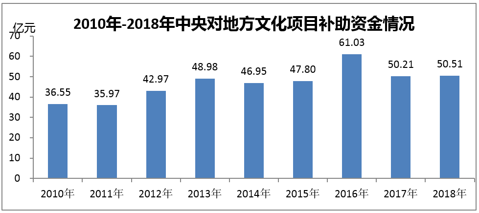 2018年,中央財政通過繼續(xù)實(shí)施“三館一站”免費(fèi)開放、非物質(zhì)文化遺產(chǎn)保護(hù)、公共數(shù)字文化建設(shè)等文化項目,共落實(shí)中央補(bǔ)助地方文化專項資金50.51億元,比上年增長0.6%。