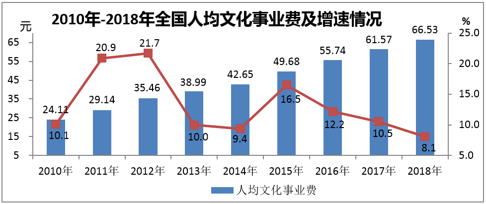 全年全國文化事業(yè)費(fèi)928.33億元,比上年增加72.53億元,增長8.5%;全國人均文化事業(yè)費(fèi)66.53元,比上年增加4.96元,增長8.1%。
