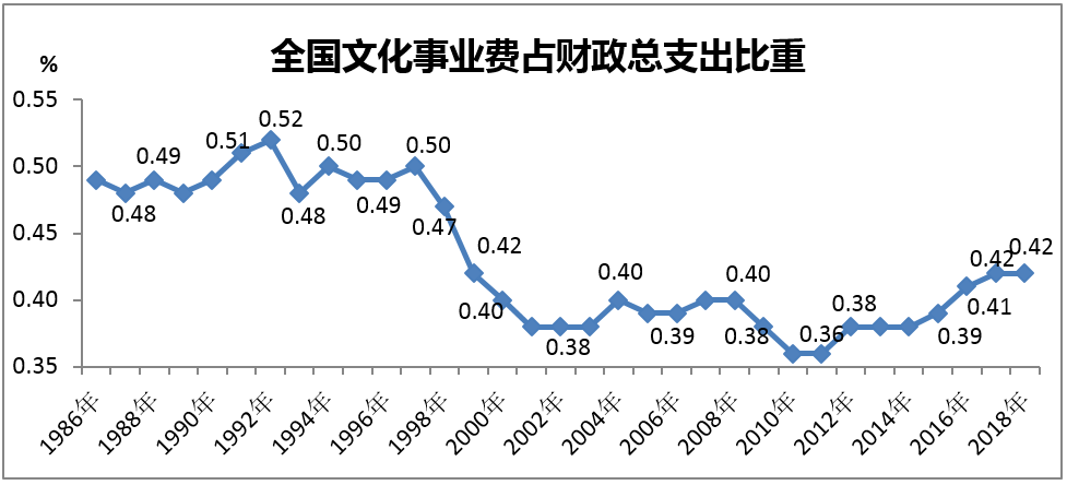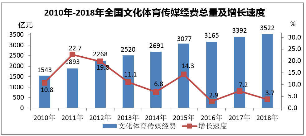 據(jù)財政部統(tǒng)計,2018年全國財政支出中,文化體育傳媒經(jīng)費(fèi)3522億元,比上年增長3.7%,占財政支出的1.59%,比重比上年下降0.07個百分點(diǎn)。