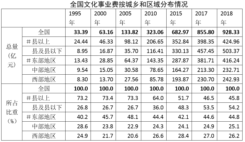 全國文化事業(yè)費(fèi)中,縣以上文化單位424.96億元,占45.8%,比重比上年降低了0.7個百分點(diǎn);縣及縣以下文化單位文化事業(yè)費(fèi)503.37億元,占54.2%,比重比上年提高了0.7個百分點(diǎn)。東部地區(qū)文化單位文化事業(yè)費(fèi)416.24億元,占44.8%,比重提高了0.2個百分點(diǎn);中部地區(qū)文化單位文化事業(yè)費(fèi)232.71億元,占25.1%,比重提高了0.2個百分點(diǎn);西部地區(qū)文化單位文化事業(yè)費(fèi)242.93億元,占26.2%,比重下降了0.8個百分點(diǎn)。