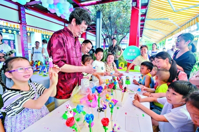 非遺傳承人在吉慶民俗街與小朋友互動(dòng)