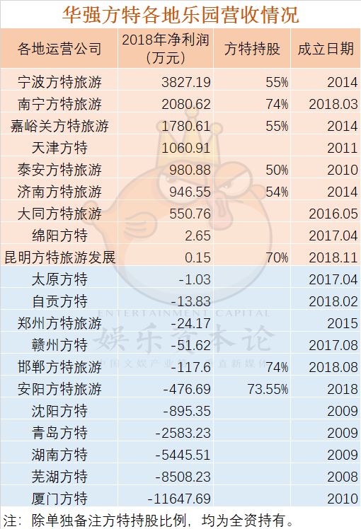 首先,華強(qiáng)方特位于各地的主題公園運(yùn)營公司中,有一半左右處于虧損的狀態(tài),其中廈門方特2018年虧損超1億元,蕪湖方特2018年虧損8500多萬元……