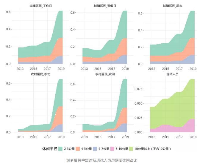 從休閑空間來看,城鄉(xiāng)居民休閑半徑不斷擴大,中短途距離休閑占比大幅提高。2019年我國城鎮(zhèn)居民工作日、周末和節(jié)假日期間休閑半徑在2-7公里以內(nèi)的比重分別為61.2%、63.1%和62.1%,農(nóng)村居民農(nóng)閑時離家2-3公里以內(nèi)休閑占比為35.8%,越來越多的城鄉(xiāng)居民在休閑時間走出家門,享受更為豐富多彩的戶外休閑活動。2019年退休居民離家8公里以上休閑比重為9.2%,旅游和郊野游憩成為越來越多退休居民的重要休閑方式。