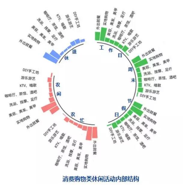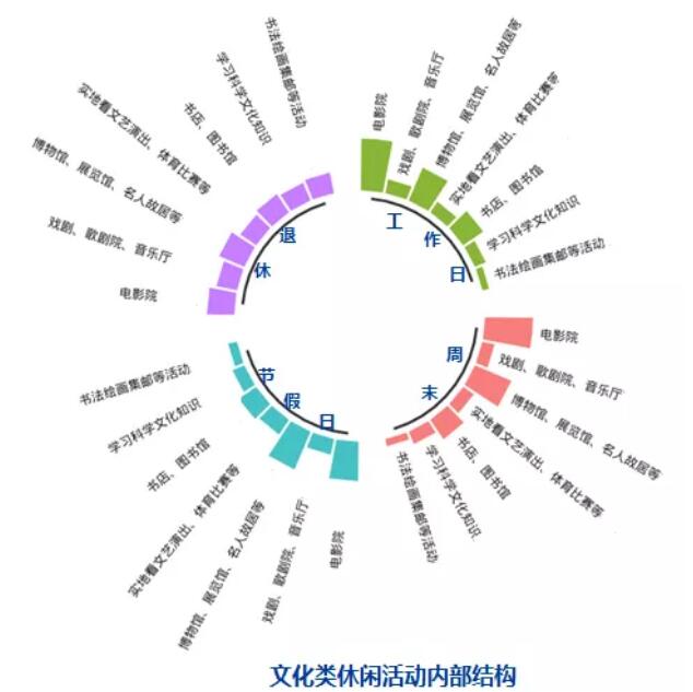 從休閑消費選擇來看,休閑活動多元化趨勢明顯。其中,消費購物類休閑活動是國民日常休閑的基礎(chǔ)選擇。數(shù)據(jù)顯示,城鄉(xiāng)居民消費購物類休閑活動平均占比40%左右,主要以實地購物、外出就餐、美容美發(fā)、游樂游藝等休閑娛樂活動為主。30%左右的受訪者閑暇時間會選擇旅游,且隨著閑暇時間的增多,異地旅游占比有所提升,如城鎮(zhèn)居民周末及節(jié)假日異地旅游比重分別為5.1%和8.0%,旅游已成為城鄉(xiāng)居民閑暇時間的重要選擇。文化類和體育健身類休閑是城鎮(zhèn)居民和退休人員休閑活動的有機構(gòu)成,二者比重之和均達(dá)20%左右,其中,文化類休閑活動主要以看電影,參觀博物館、展覽館、科技館、藝術(shù)館、名人故居以及去書店、圖書館等休閑活動為主。