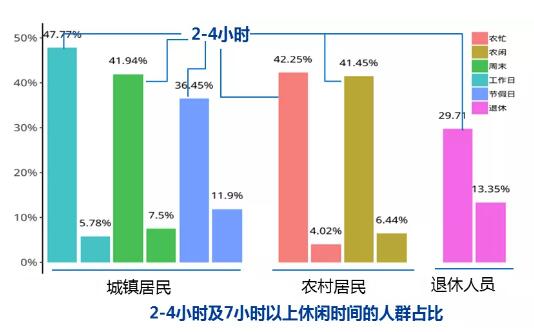 從休閑時間來看,城鄉(xiāng)居民休閑時間隨可支配時間變化而波動,工作日和農(nóng)忙期間城鄉(xiāng)居民勞動強度大,可支配時間少,休閑時間相對較短;城鄉(xiāng)居民每日休閑時間平均以2-4小時為主。數(shù)據(jù)顯示,33.6%的受訪城鎮(zhèn)居民工作日工作時間達(dá)9小時以上;有40%的城鄉(xiāng)居民在工作日、周末、農(nóng)忙、農(nóng)閑時每日休閑時間為2-4小時,而休閑時間7小時以上的城鄉(xiāng)居民占比隨可支配時間增多而依次提升;退休無業(yè)人員由于不受時間限制,休閑時間7小時以上的受訪者占比最高,為13.4%。