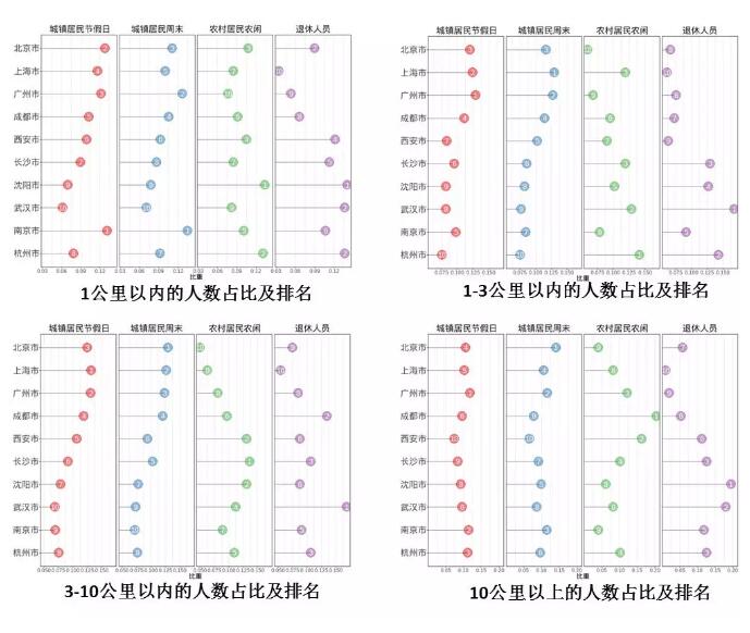 從國民休閑行為的區(qū)域差異來看,在調(diào)研的10個城市中,北京、上海、廣州、成都4市城鎮(zhèn)居民在周末、節(jié)假日更喜歡外出休閑,其選擇在離家3-10公里范圍內(nèi)進(jìn)行休閑的人數(shù)占比具有絕對優(yōu)勢;長沙、西安、沈陽、武漢4市的農(nóng)村居民在農(nóng)閑時喜歡到離家3-10公里范圍內(nèi)進(jìn)行休閑;沈陽、武漢、長沙、杭州4市退休居民則喜歡遠(yuǎn)距離休閑。從休閑內(nèi)容來看,北京、上海、廣州、成都4市城鎮(zhèn)居民在周末、節(jié)假日喜歡旅游、消費購物和參與文化類休閑活動,其中,選擇消費購物的人數(shù)占比在10個城市中具有絕對優(yōu)勢;武漢、長沙、廣州、西安4市農(nóng)村居民農(nóng)閑時喜歡文化類休閑活動,而沈陽、杭州等市農(nóng)村居民農(nóng)閑時更喜歡消費購物;武漢、沈陽、杭州等市退休人員更喜歡旅游和體育健身。