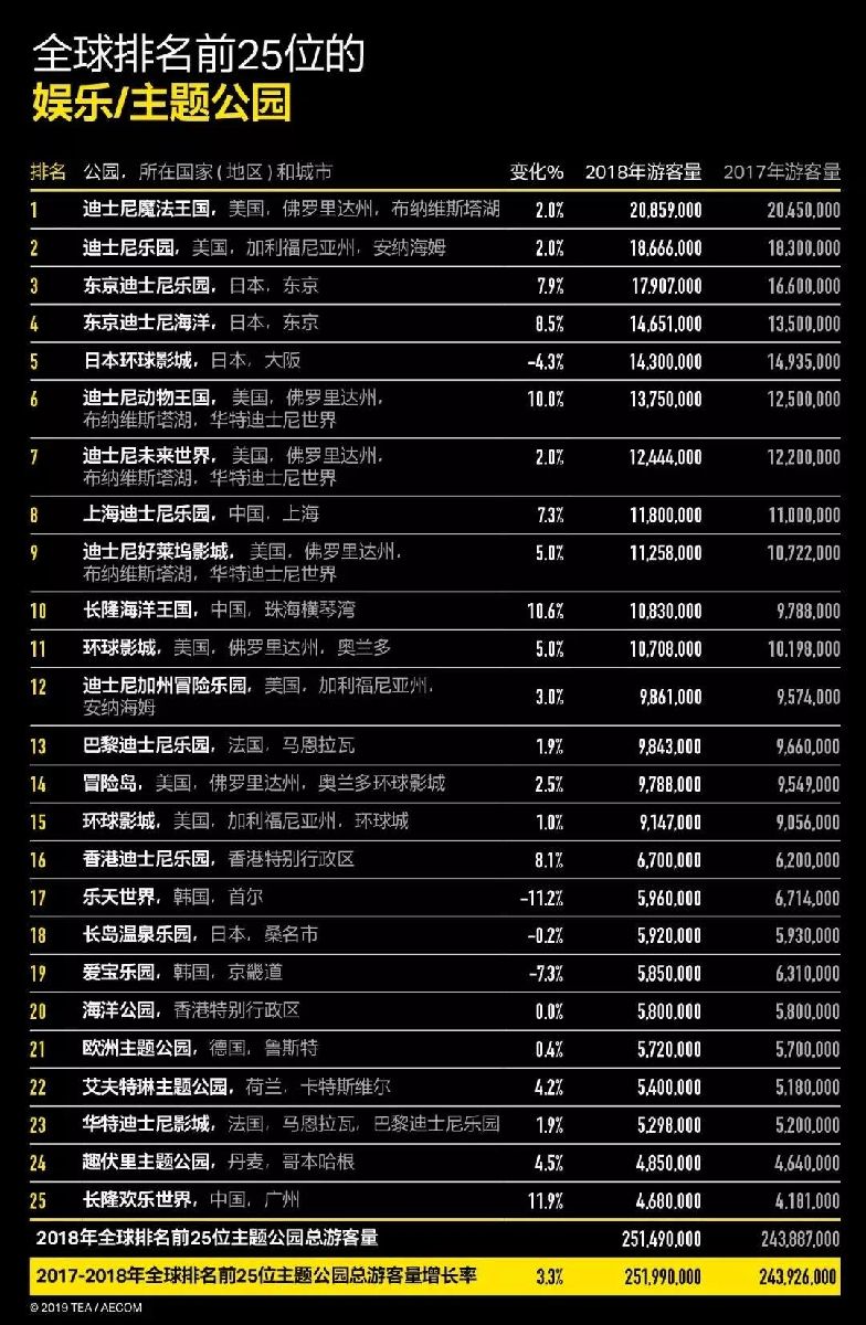 報(bào)告根據(jù)客流量列出了全球前25名樂園。榜單前四名毫無意外地被迪士尼占據(jù),但上面也出現(xiàn)了來自中國(guó)的兩家本土文旅企業(yè)。