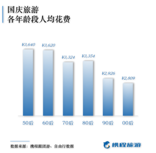 什么年齡段的中國人更偏愛在國慶出行?根據(jù)攜程跟團游和自由行訂單數(shù)據(jù),80后和90后已經(jīng)成為國慶出游的絕對主力人群,占出行總人數(shù)的51%。而報告顯示,在各年齡段的花費上,50后成為最舍得花錢的人群,單次旅游人均花費達到了3640元。