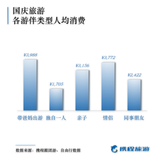 此外,親子游是國慶假期出游的主流,占比達35%,利用難得的假期和孩子共度是多少父母的選擇。而選擇情侶的占比也不少,達到了23%。帶父母出游的人均花費最高,達到了3988元,而情侶出游緊隨其后,也達到了3772元。