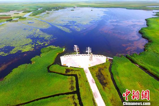 凌空鳥(niǎo)瞰博湖縣博斯騰湖蓮海世界景區(qū)。 年磊 攝