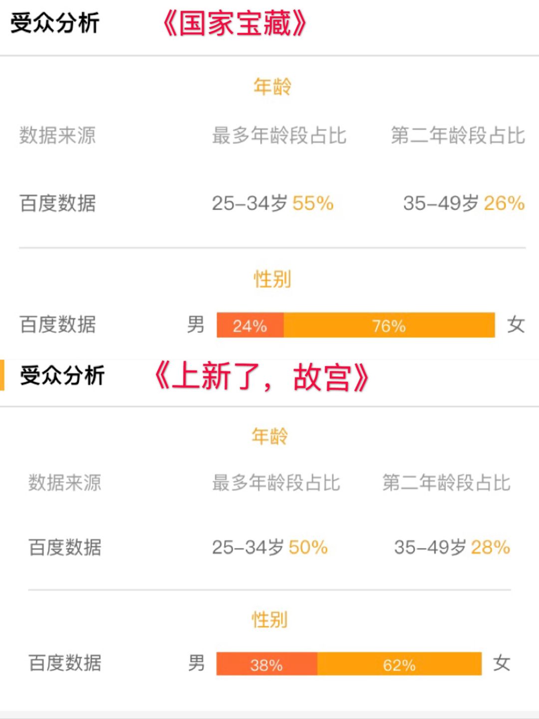 并且,這些作品的受眾群體都主要是25歲到34歲的青年女性,其中《國(guó)家寶藏》這個(gè)年齡段的占50%,《上新了,故宮》占55%,都是一半以上。博物館、文化相關(guān)綜藝,秉承著傳承文化的基礎(chǔ)上,也開始俏皮活潑起來(lái)。