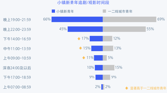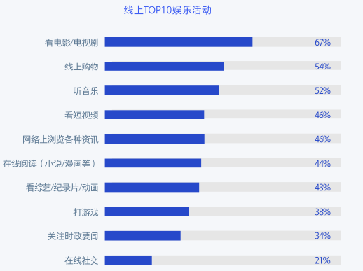 小鎮(zhèn)新青年每日線上平均休閑時長為3.74小時,可自由支配時間較多。線上觀看電影/影視劇是小鎮(zhèn)新青年首選的娛樂形式(67%),日均追劇1.64小時。