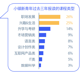 62%的小鎮(zhèn)新青年在過去三年曾報讀自我提升課程。實現(xiàn)升學(xué)&考研,滿足學(xué)習(xí)新知識的興趣愛好、提升職業(yè)技能是排名前三的課程選擇。