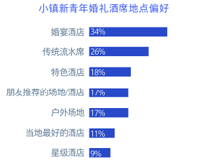 近半數(shù)的小鎮(zhèn)新青年認(rèn)為婚宴、婚禮、婚房缺一不可,58%的小鎮(zhèn)新青年在 婚房的需求上更傾向于一手房。小鎮(zhèn)新青年平均在婚禮/酒席上的花費為42624元,低于一二線城市。在地點選擇上,他們更傾向于氛圍濃厚的婚宴酒店及傳統(tǒng)流水席