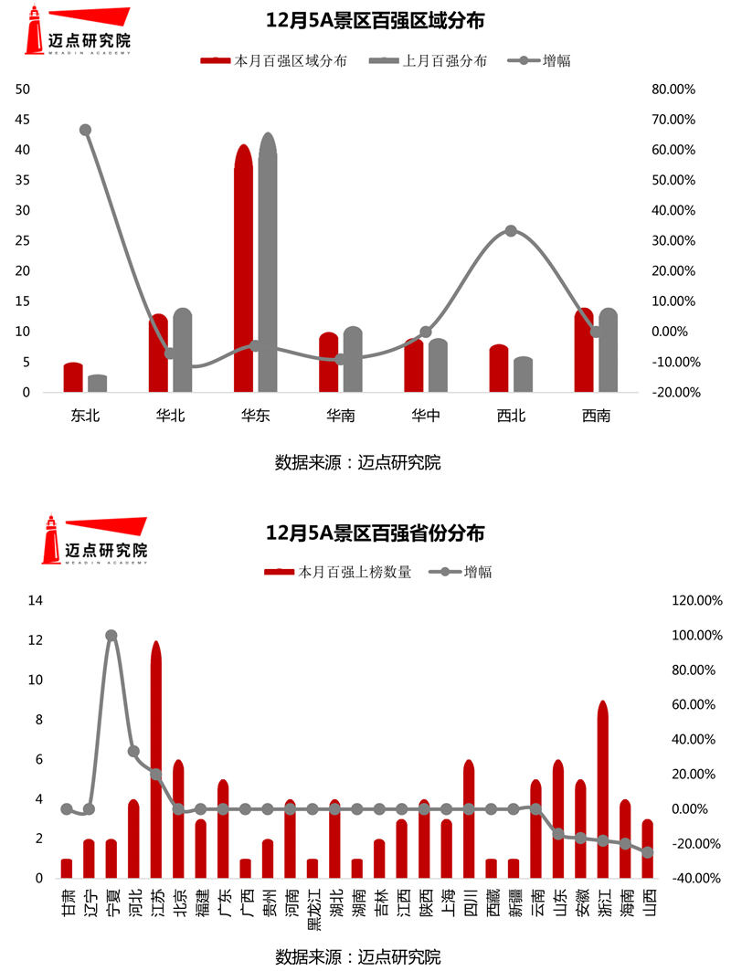 環(huán)比上月,本月華北、華東及華南地區(qū)市場熱度減退,但東北和西北地區(qū)上榜景區(qū)數量呈現出大幅上漲態(tài)勢,其中東北增幅最為顯著,環(huán)比上升66.67%。相較于其他省份,本月 遼寧甘肅表現突出,區(qū)域內百強景區(qū)從無到有,實現跨越式增長。東北地區(qū)生態(tài)環(huán)境優(yōu)越,森林、草原、濕地、冰雪旅游資源獨具特色,在12月數據監(jiān)測中,該地區(qū)共有5家景區(qū)進入百強名單,其中本溪市本溪水洞景區(qū)和大連老虎灘海洋公園作為百強新秀成功入圍。西北地區(qū)本月表現尤為亮眼,甘肅敦煌鳴沙山月牙泉景區(qū)繼8月份后再度晉級百強。