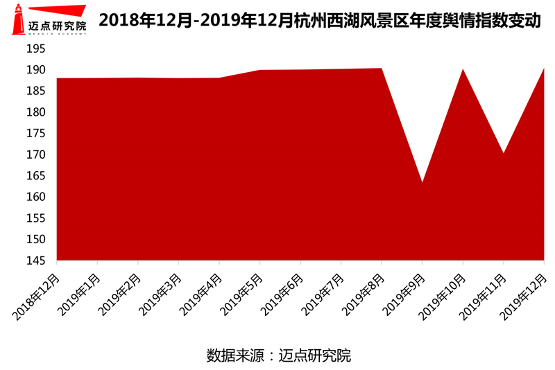 在反映實際客群關注度方面的輿情指數上,本月表現突出的是杭州西湖風景區(qū)。經邁點研究院數據監(jiān)測,12月杭州西湖輿情指數高達190.49,環(huán)比增長11.81%。從全年該景區(qū)輿情指數變動來看,除9月及11月呈現小幅度下降之外,整體處于穩(wěn)步發(fā)展態(tài)勢。