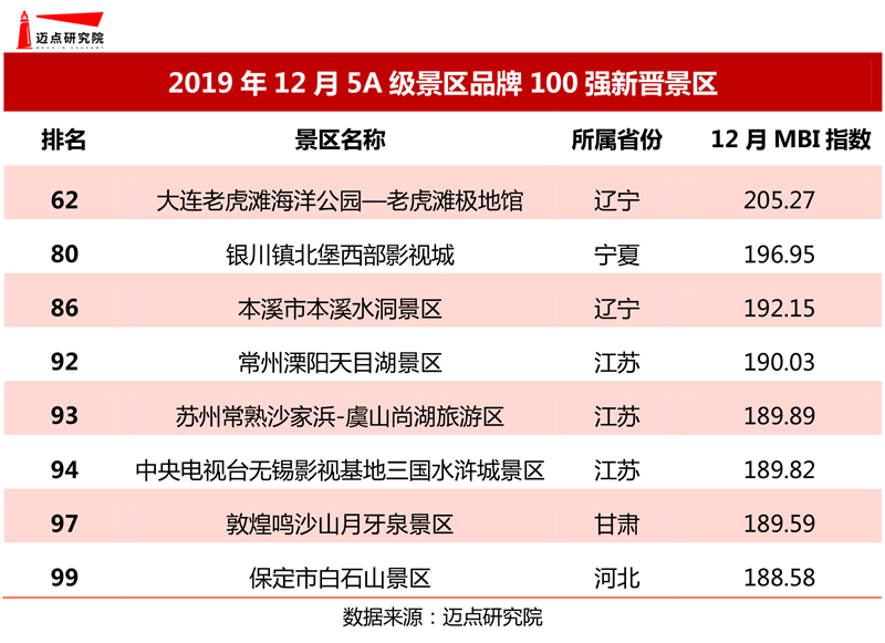 “2019年12月5A級景區(qū)品牌100強榜單”數據來源于邁點品牌指數MBI,根據12月邁點品牌指數MBI的258個5A景區(qū)數據匯總統(tǒng)計而成。具體說明如下: