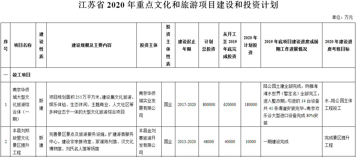 2月12日,江蘇省文化和旅游廳官網(wǎng)公布2020年江蘇省重點文化和旅游項目建設(shè)及投資計劃,南京華僑城大型文化旅游綜合體(一期)等60個文旅項目在列。