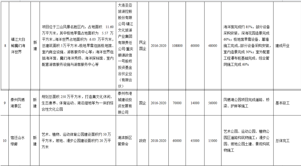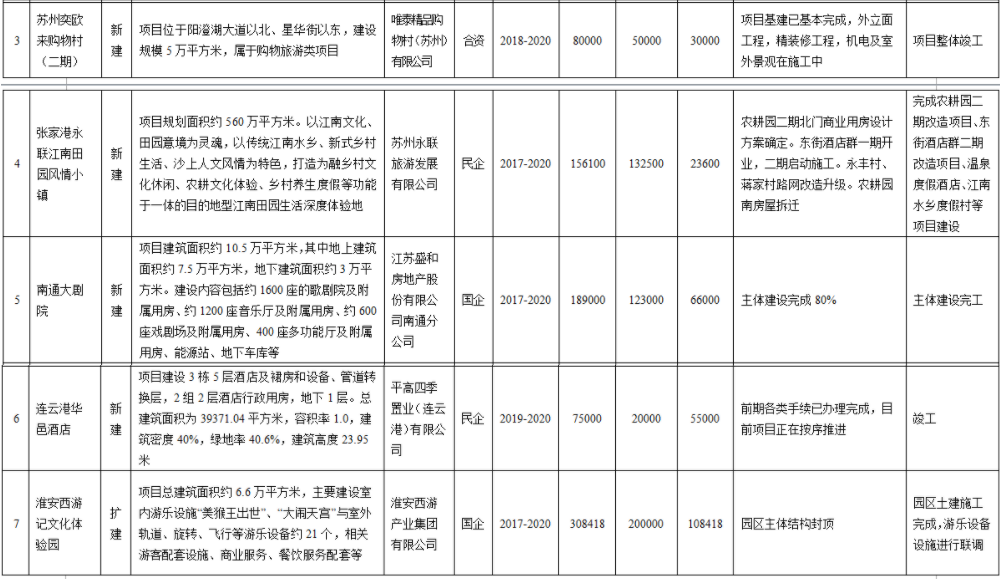 根據(jù)投資計劃,南京華僑城大型文化旅游綜合體(一期)、豐縣劉邦故里文化景區(qū)提升工程、蘇州奕歐來購物村(二期)、張家港永聯(lián)江南田園風情小鎮(zhèn)、南通大劇院、連云港華邑酒店、淮安西游記文化體驗園、鎮(zhèn)江大白鯨魔幻海洋世界、泰州鳳棲湖景區(qū)、宿遷山水綠廊等10個項目將在今年竣工。