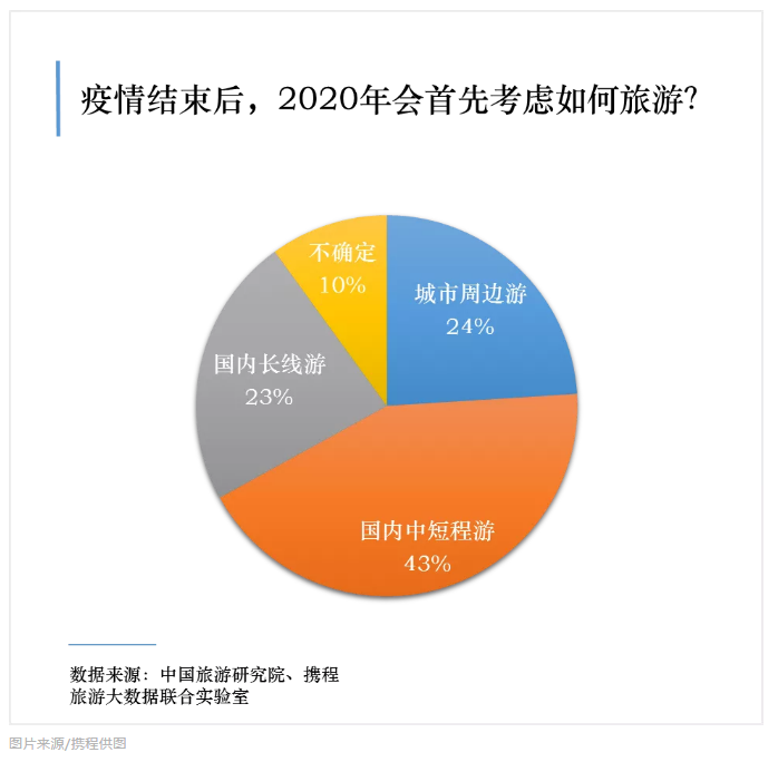 疫情結(jié)束后會先去哪里旅游?有90%以上的被調(diào)查者選擇國內(nèi)游。其中,城市周邊游、國內(nèi)中短程游、國內(nèi)長線游是主要選擇,分別占比24%、43%、23%。目前在線旅游平臺產(chǎn)品上線和預(yù)訂情況也符合這一趨勢,景區(qū)門票、門票+酒店套餐、周邊游線路率先復(fù)蘇。