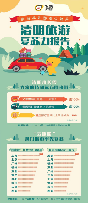 根據(jù)飛豬大數(shù)據(jù)顯示,清明出游熱門城市九成是“云旅游”熱門城市,旅游復(fù)蘇從云端走到線下,大批用戶計(jì)劃清明走出家門,“拔草”云旅游場景里的網(wǎng)紅酒店、樂園和景區(qū),踏青賞花看動(dòng)物。