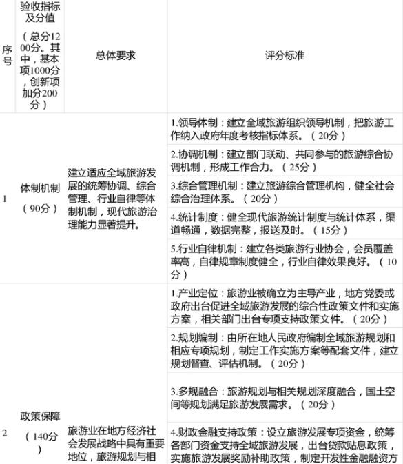 第八條 文化和旅游部制定《國家全域旅游示范區(qū)驗(yàn)收標(biāo)準(zhǔn)(試行)》(以下簡稱《標(biāo)準(zhǔn)》)?!稑?biāo)準(zhǔn)》基本項(xiàng)目總分1000分,創(chuàng)新項(xiàng)目加分200分,共計(jì)1200分。通過省級文化和旅游行政部門初審驗(yàn)收的最低得分為1000分。