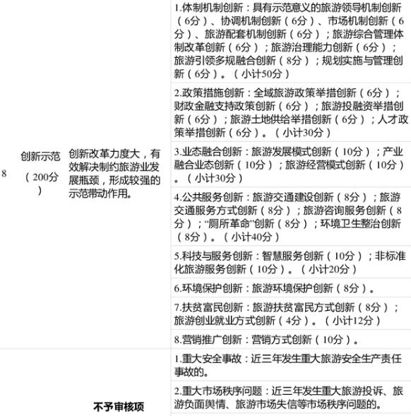 8.創(chuàng)新示范。大力推進(jìn)改革創(chuàng)新,積極破除全域旅游發(fā)展的瓶頸和障礙,具有解決地方旅游業(yè)長期發(fā)展問題的突破性、實(shí)質(zhì)性措施,或在全國產(chǎn)生重要影響的發(fā)展全域旅游的示范性創(chuàng)新舉措。