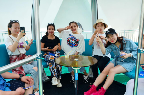 白浪河入???,水勢平緩,河面寬闊,“渤海之眼”摩天輪矗立在白浪河上,高145米,是世界上最高的無軸式摩天輪、世界上首例編織網(wǎng)格摩天輪、世界上首次無軸式輪橋合一摩天輪,自2018年運行以來,游人如織,已成為網(wǎng)紅打卡地?!拔覀兪菑亩兑羯峡吹?,開車過來到網(wǎng)紅地打卡,到了眼前覺得這摩天輪特別壯觀,乘坐感覺很好,挺寬敞、挺平穩(wěn)?!眮碜宰筒┑挠慰蛷埾壬拥卣f?!安澈Q邸蹦μ燧?,登高望遠,俯瞰海河風(fēng)光。86歲的老黨員單吉祿第一次在145米的摩天輪轎廂里俯瞰家鄉(xiāng),“濱海變化太大了,感覺真的很幸福?!?/p>